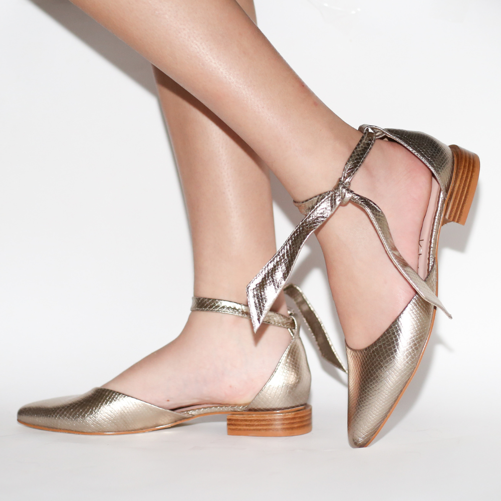Detalhe: Três opções de amarração na perna, sendo uma em metal na cor dourada, e duas em couro.