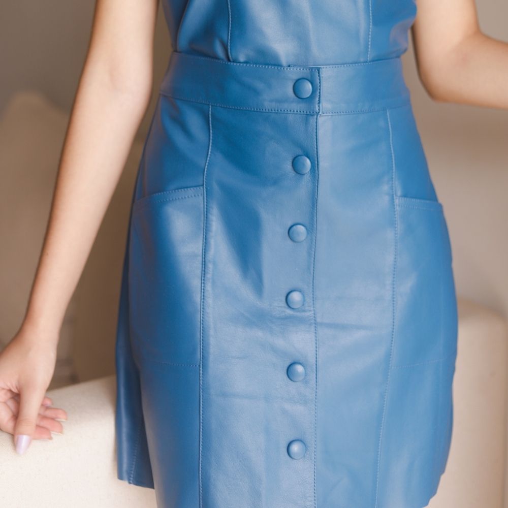 Saia Couro Pelica Curta Botões Azul Royal - Karine Daher