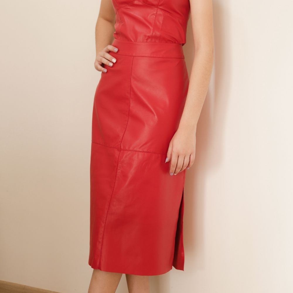 Saia Couro Pelica Midi Fenda Vermelha - Karine Daher