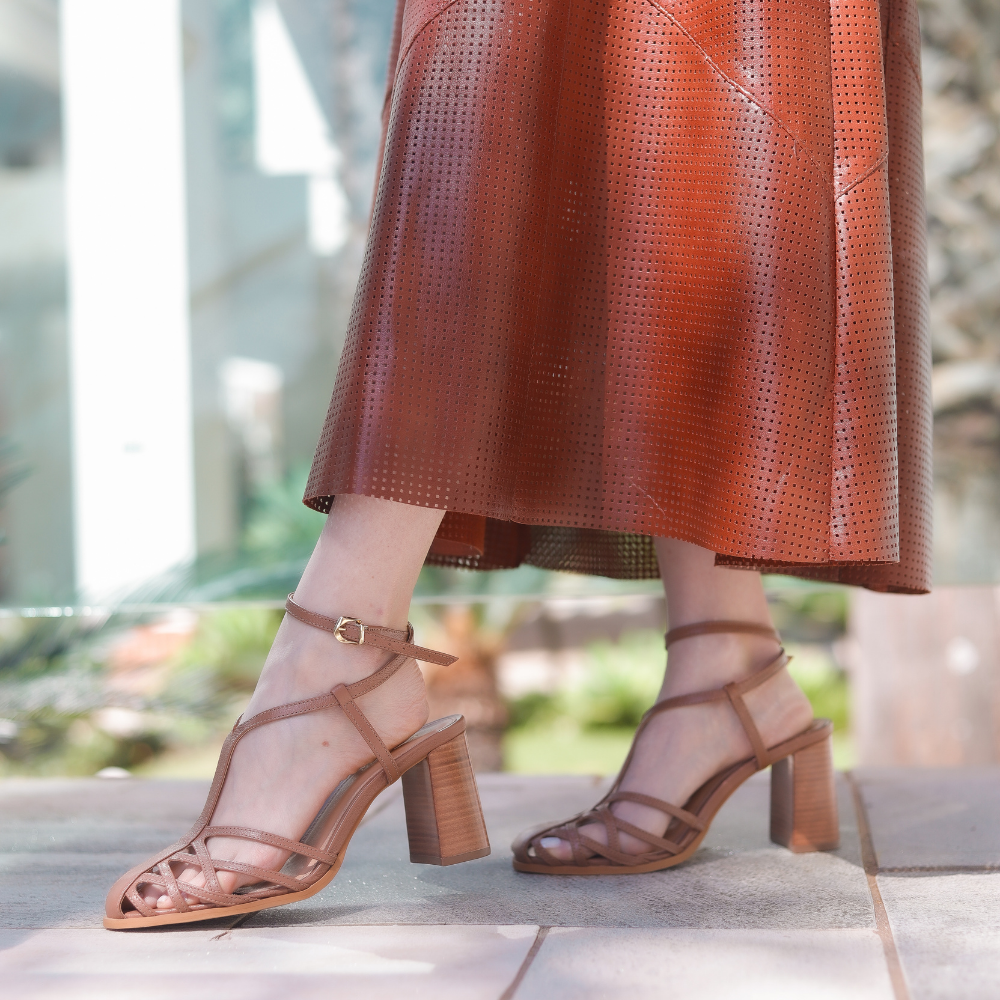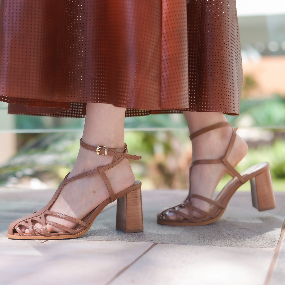Detalhe: Tiras fina em couro na parte superior , salto bloco, bico arredondado e fecho no tornozelo