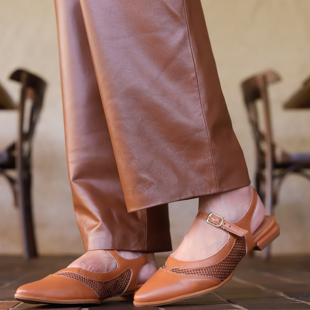 Detalhe: Transparência frontal em tela, bico fino, fecho em metal dourado salto baixo encapado Material: Couro legítimo Solado: Borracha Salto: 2,3cm
